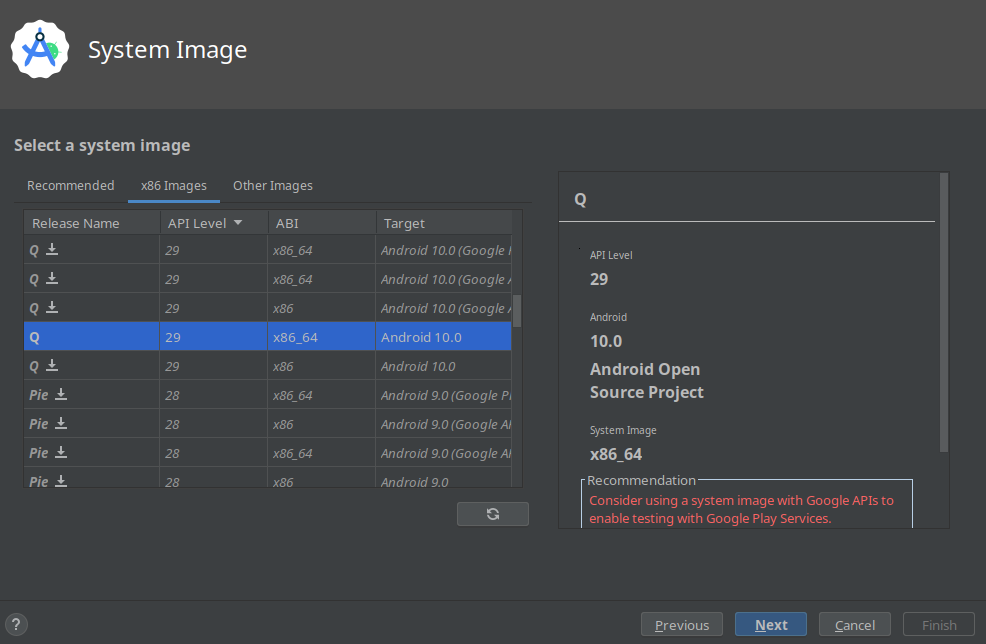 When creating Virtual Device, do not select Recomended image as it’s not rootable. Select X86-image (as I’m using AMD64 proc) and then select Android Q, as shown in screenshot below.